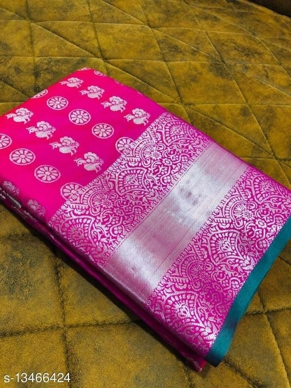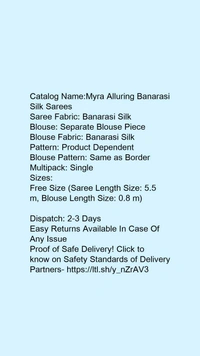 Aa-ha! Banarasi Silk Sarees Saree Fabric: Banarasi Silk Blouse: Separate Blouse Piece Blouse Fabric: Banarasi Silk Pattern: Woven Design Blouse Pattern: Same as Border Multipack: Single Sizes: Free Size (Saree Length Size: 5.5 m, Blouse Length Size: 0.8 m) Country of Origin: India
