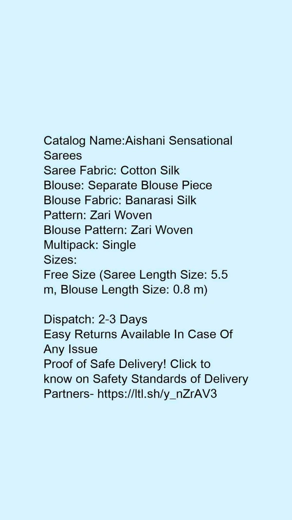 Checkout this latest Sarees Product Name: Adrika Fashionable Sarees Saree Fabric: Cotton Silk Blouse: Separate Blouse Piece Blouse Fabric: Banarasi Silk Pattern: Zari Woven Blouse Pattern: Solid Multipack: Single Sizes: Free Size (Saree Length Size: 5.5 m, Blouse Length Size: 0.8 m) Country of Origin: India Easy Returns Available In Case Of Any Issue