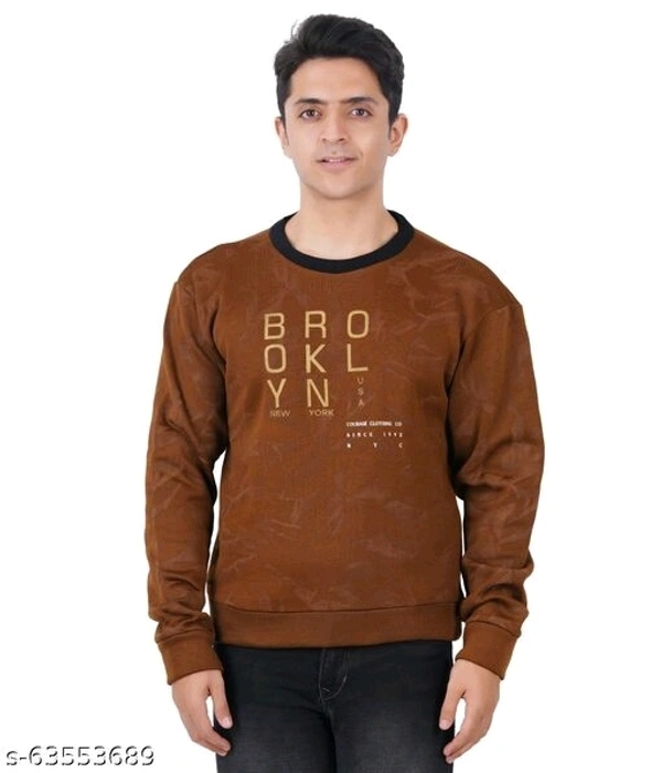 Brown crew neck mens full sleeve polyester fleece sweatshirt Fabric: Polyester Sleeve Length: Long Sleeves Pattern: Printed Multipack: 1 Sizes: S (Chest Size: 38 in, Length Size: 24 in, Waist Size: 38 in, Hip Size: 38 in) XL (Chest Size: 44 in, Length Size: 27 in, Waist Size: 44 in, Hip Size: 44 in) L (Chest Size: 42 in, Length Size: 26 in, Waist Size: 42 in, Hip Size: 42 in) M (Chest Size: 40 in, Length Size: 25 in, Waist Size: 40 in, Hip Size: 40 in) 100% Polyester Fleece Men's Cozy Sweatshirt Country of Origin: India