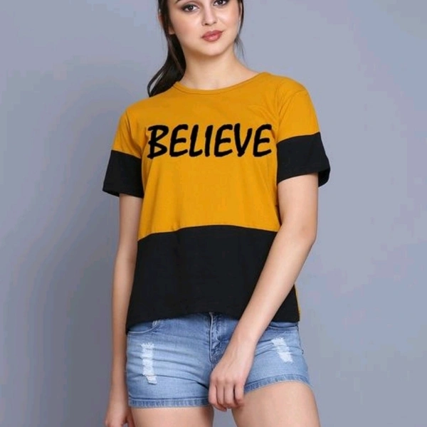 Classic Partywear Women Tshirts Fabric: Cotton Sleeve Length: Short Sleeves Pattern: Colorblocked Multipack: 1 Sizes: S (Bust Size: 34 in) XL (Bust Size: 40 in) XS (Bust Size: 32 in) L (Bust Size: 38 in) M (Bust Size: 36 in) Country of Origin: India