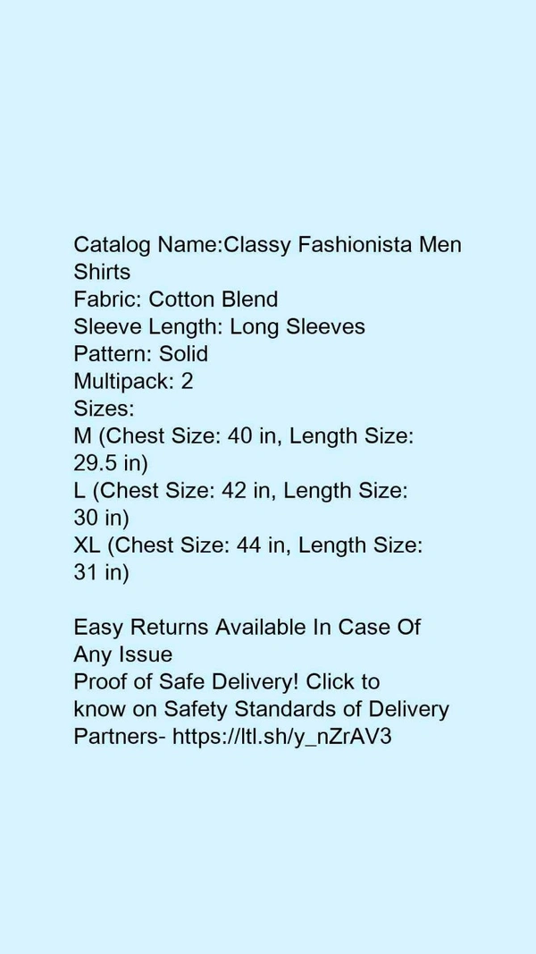 Classy Elegant Men Shirts Fabric: Cotton Blend Sleeve Length: Long Sleeves Pattern: Solid Multipack: 2 Sizes: XL (Chest Size: 44 in, Length Size: 31 in) L (Chest Size: 42 in, Length Size: 30 in) M (Chest Size: 40 in, Length Size: 29.5 in) Country of Origin: India