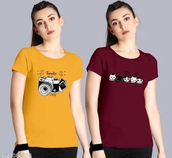 Combo Classic Designer Women Tshirts Fabric: Cotton Sleeve Length: Short Sleeves Pattern: Printed Multipack: 2 Sizes: S (Bust Size: 34 in, Length Size: 24 in) XL (Bust Size: 40 in, Length Size: 25 in) L (Bust Size: 38 in, Length Size: 25 in) M (Bust Size: 36 in, Length Size: 24 in) Gorgeous and beautiful T-shirt made in Good quality. This T-shirt made from 100% Cotton Fabric which is Comfortable to Wear.This T-shirt comes In all Standard Sizes and also Available in Different Colours, so you can be Wear according to your choice and preference.The product is a versatile wear in functions, festivals, parties, wedding, ceremonies, events,everyday. Country of Origin: India