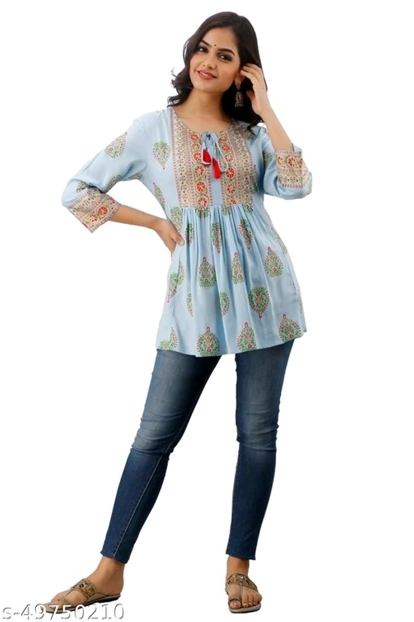 DMP315 AQUA PRINTED TOP Fabric: Rayon Sleeve Length: Three-Quarter Sleeves Pattern: Printed Multipack: 1 Sizes: S, XL, L, M, XXL DPE Women's Rayon Printed Top with Beautiful Tasseles at Front Country of Origin: India