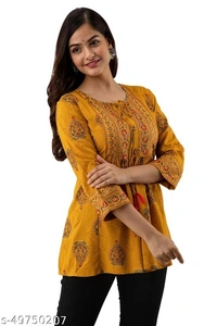 DMP316 YELLOW PRINTED TOP Fabric: Rayon Sleeve Length: Three-Quarter Sleeves Pattern: Printed Multipack: 1 Sizes: S, XL, L, M, XXL DPE Women's Rayon Printed Top with Beautiful Tasseles at Front Country of Origin: India
