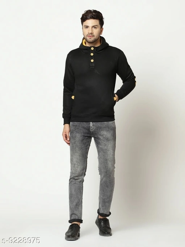 Elegance Men's Black Solid Hooded Sweatshirt With Contrast Button