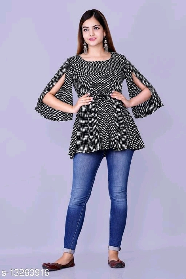 Fancy Fabulous Women Tops & Tunics Fabric: Rayon Sleeve Length: Three-Quarter Sleeves Pattern: Printed Multipack: 1 Sizes: S (Bust Size: 36 in, Length Size: 26 in) XL (Bust Size: 42 in, Length Size: 26 in) L (Bust Size: 40 in, Length Size: 26 in) M (Bust Size: 38 in, Length Size: 26 in) XXL (Bust Size: 44 in, Length Size: 26 in) Country of Origin: India