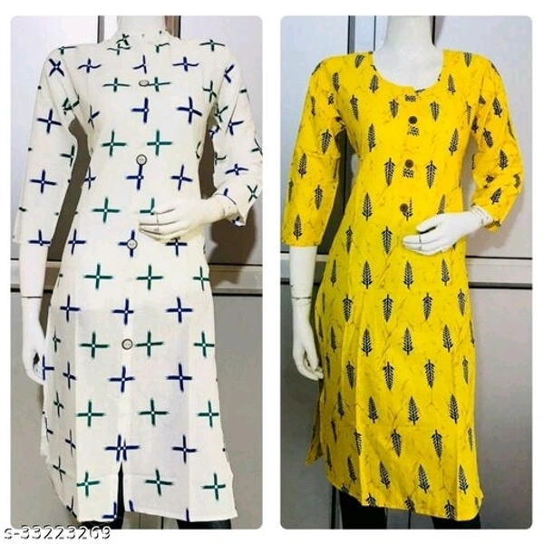Fancy Kurtis Fabric: Cotton Sleeve Length: Three-Quarter Sleeves Pattern: Printed Combo of: Combo of 2 Sizes: XL (Bust Size: 44 in, Size Length: 42 in) L (Bust Size: 42 in, Size Length: 42 in) M (Bust Size: 40 in, Size Length: 42 in) XXL (Bust Size: 46 in, Size Length: 42 in) trending cotton straight combo kurtis Country of Origin: India