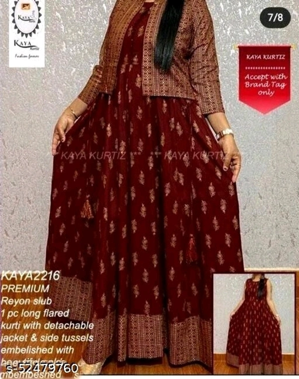 Trendy Drishya Kurtis Fabric: Rayon Sleeve Length: Three-Quarter Sleeves Pattern: Embellished Combo of: Single Sizes: XL (Bust Size: 42 in, Size Length: 48 in) L (Bust Size: 40 in, Size Length: 48 in) M (Bust Size: 38 in, Size Length: 48 in) XXL (Bust Size: 44 in, Size Length: 48 in) Size: M to XXL, Fabric: Rayon, Kurta with Jacket, Flared, Printed, Gold Printed, Latkan, Dailywear, Partywear Country of Origin: India