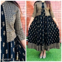 Trendy Drishya Kurtis Fabric: Rayon Sleeve Length: Three-Quarter Sleeves Pattern: Embellished Combo of: Single Sizes: XL (Bust Size: 42 in, Size Length: 48 in) L (Bust Size: 40 in, Size Length: 48 in) M (Bust Size: 38 in, Size Length: 48 in) XXL (Bust Size: 44 in, Size Length: 48 in) Size: M to XXL, Fabric: Rayon, Kurta with Jacket, Flared, Printed, Gold Printed, Latkan, Dailywear, Partywear Country of Origin: India