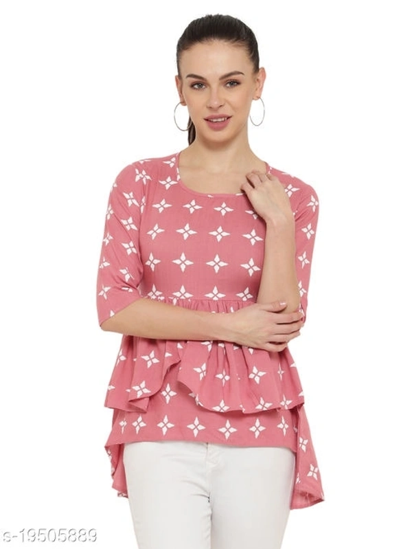 Trendy Graceful Women Tops & Tunics Fabric: Rayon Sleeve Length: Three-Quarter Sleeves Pattern: Printed Sizes: S (Bust Size: 36 in, Length Size: 26 in) XL (Bust Size: 42 in, Length Size: 26 in) L (Bust Size: 40 in, Length Size: 26 in) M (Bust Size: 38 in, Length Size: 26 in) XXL (Bust Size: 44 in, Length Size: 26 in) Country of Origin: India