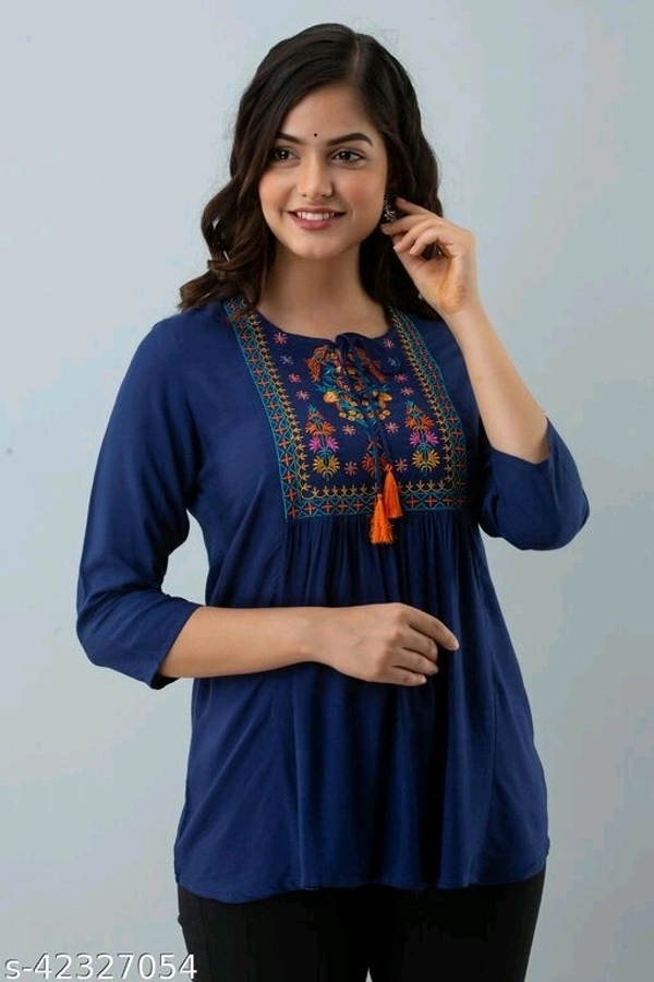 Woman Care Embroidered Tops Fabric: Rayon Sleeve Length: Three-Quarter Sleeves Pattern: Embroidered Multipack: 1 Sizes: S (Bust Size: 36 in, Length Size: 28 in) XL (Bust Size: 42 in, Length Size: 28 in) L (Bust Size: 40 in, Length Size: 28 in) M (Bust Size: 38 in, Length Size: 28 in) XXL (Bust Size: 44 in, Length Size: 28 in) Checkout this hot & latest Tops Country of Origin: India