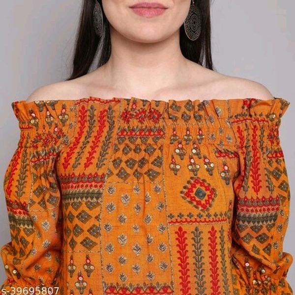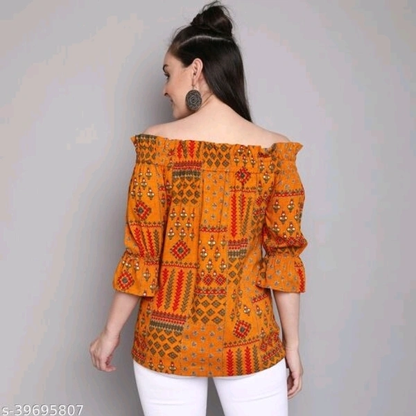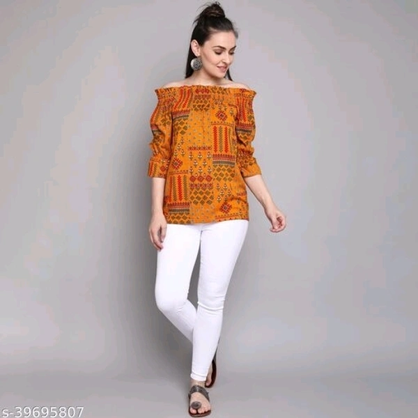Women's foil printed rayon top Fabric: Rayon Sleeve Length: Three-Quarter Sleeves Pattern: Printed Multipack: 1 Sizes: S (Bust Size: 34 in, Length Size: 40 in) XL (Bust Size: 40 in, Length Size: 40 in) L (Bust Size: 38 in, Length Size: 40 in) M (Bust Size: 36 in, Length Size: 40 in) XXL (Bust Size: 42 in, Length Size: 40 in) Country of Origin: India